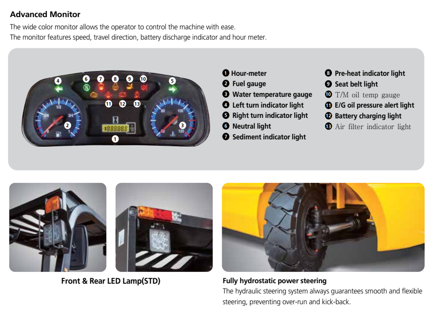 Động cơ mạnh mẽ: Xe này được trang bị động cơ dầu Diesel đáng tin cậy, giúp cung cấp công suất cao để nâng và di chuyển tải trọng dễ dàng và hiệu quả.