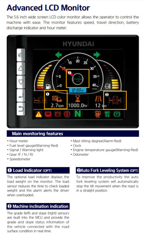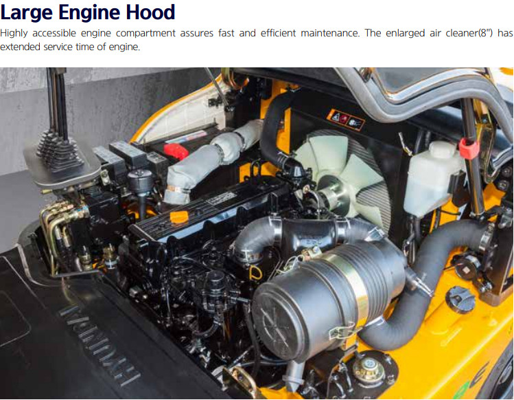 Hiệu suất ấn tượng: Xe nâng Hyundai 33D-9E được trang bị động cơ Diesel mạnh mẽ, giúp tăng cường hiệu suất làm việc và giảm thời gian hoàn thành công việc.