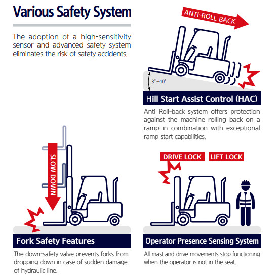 An toàn: Máy móc này có các tính năng an toàn như hệ thống phanh đáng tin cậy, ánh sáng chiếu sáng, còi báo động, và bệ phóng nếu cần thiết.