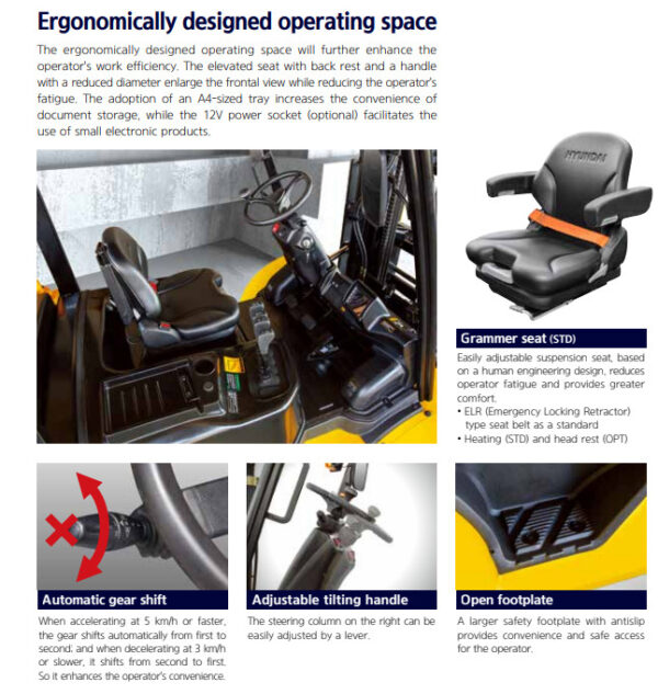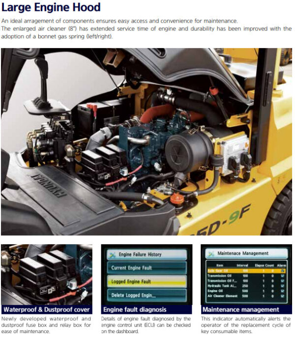 An toàn: Xe nâng Hyundai 45D-9F có hệ thống an toàn toàn diện bao gồm hệ thống phanh an toàn, ánh sáng cảnh báo, và hệ thống cảnh báo lùi.
