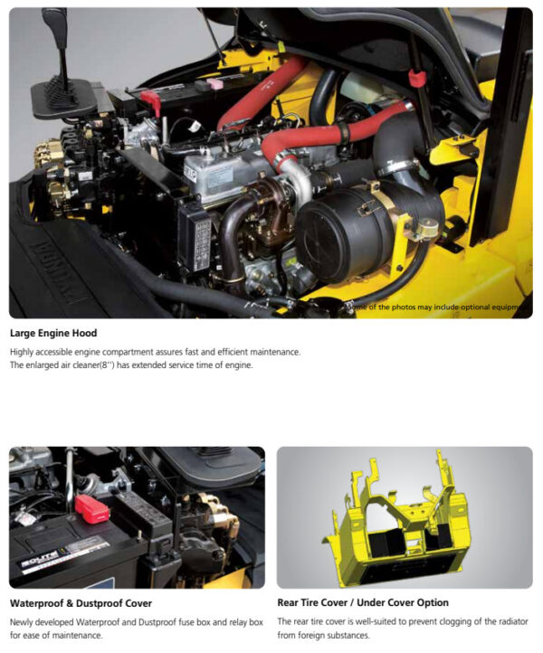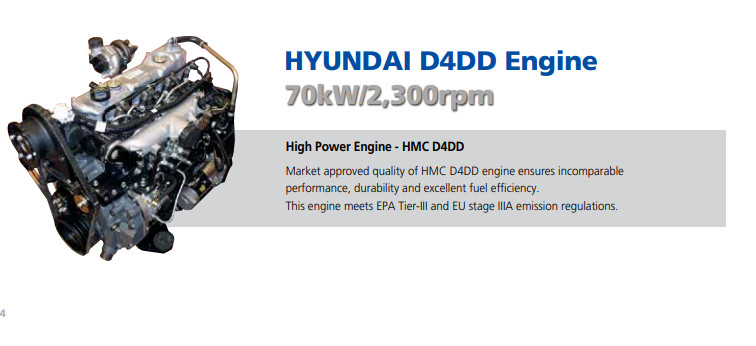 Động cơ mạnh mẽ: Xe nâng này được trang bị động cơ dầu Hyundai chất lượng cao, cung cấp công suất mạnh mẽ để đảm bảo hiệu suất làm việc ổn định và tiết kiệm nhiên liệu.
