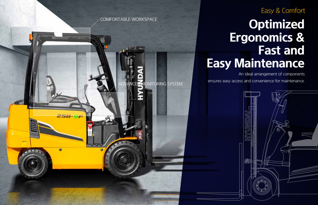 Thiết kế của xe nâng Hyundai 22B-9F tập trung vào sự tiện lợi với tay lái điều khiển dễ sử dụng, khung nâng chắc chắn và một cabin thoải mái cho người điều khiển.