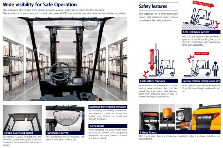 Xe nâng điện Hyundai 2.2 Tấn 22B-9F có nhiều tính năng an toàn như hệ thống phanh an toàn, hệ thống cảnh báo lùi, và hệ thống báo hiệu ánh sáng để đảm bảo an toàn khi vận hành.
