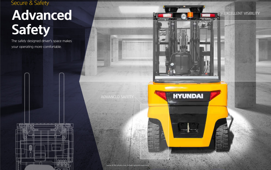 Xe nâng Hyundai này có nhiều tính năng an toàn như hệ thống phanh an toàn, đèn báo hiệu, còi báo động, và cảnh báo quá tải, giúp ngăn ngừng tai nạn và bảo vệ người làm việc.