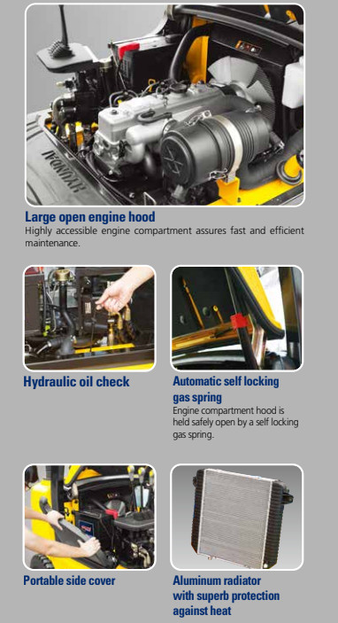 Động cơ mạnh mẽ: Xe nâng dầu Hyundai 3.3 Tấn 33DF-7 Được trang bị động cơ dầu hiệu suất cao, giúp xe hoạt động ổn định và tiết kiệm nhiên liệu.
