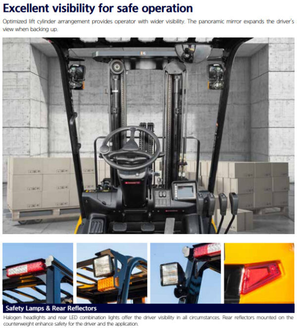 Hệ thống an toàn: Xe nâng được trang bị các tính năng an toàn như hệ thống phanh hiệu quả và cảnh báo an toàn.